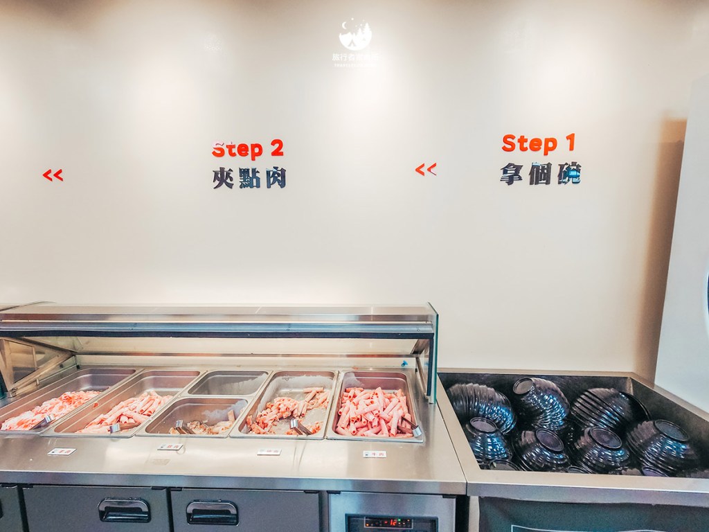 入座後服務人員會簡單說明用餐規定與是否要加火鍋,我們有加購一鍋【麻油鍋】,晚上天涼又立冬了,想說要補一下!店家也很貼心的把點餐步驟都「鑲嵌」在牆上,蒙古烤肉就是單一路線大家都會乖乖排隊。