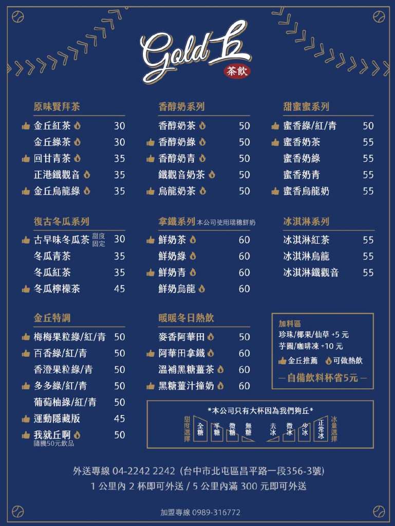 GOLD丘茶飲,位於北屯區昌平路上,這裡街區特色就是吃的喝的都很多同時也滿競爭的,但有特色、好吃的店,總是可以受到消費者的青睞。GOLD丘茶飲的老闆想必很年輕且有想法,店名應該是取自諧音「夠邱」相對好記,不然喝過一次後也會記得它是棒球風飲料店,總之在特色上,已經贏一般的獨立飲料店嘍。