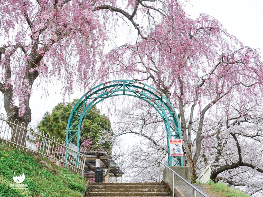 由於月岡公園的地勢也是比較高一點,所以從公園可以俯瞰平地的民宅,還有滿開的垂枝櫻搭配,能得此景,人生真是幸福啊!!