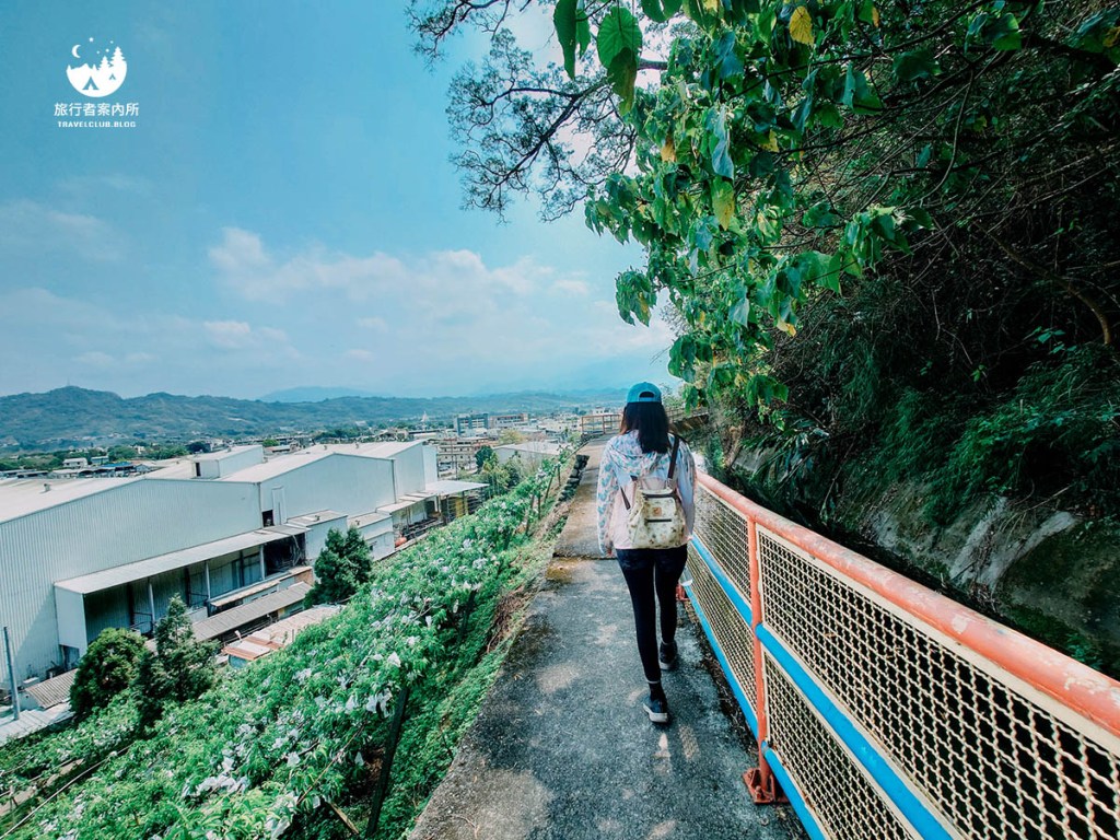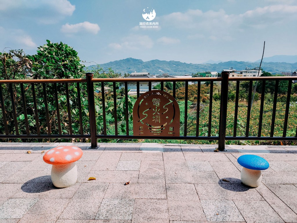 中段有個景觀平台,可以看到低處的石岡區民家日常景色,空氣很好!還有一些可愛的蘑菇造景,也可以跟地面上立體的「電火圳」拍照留念喔!