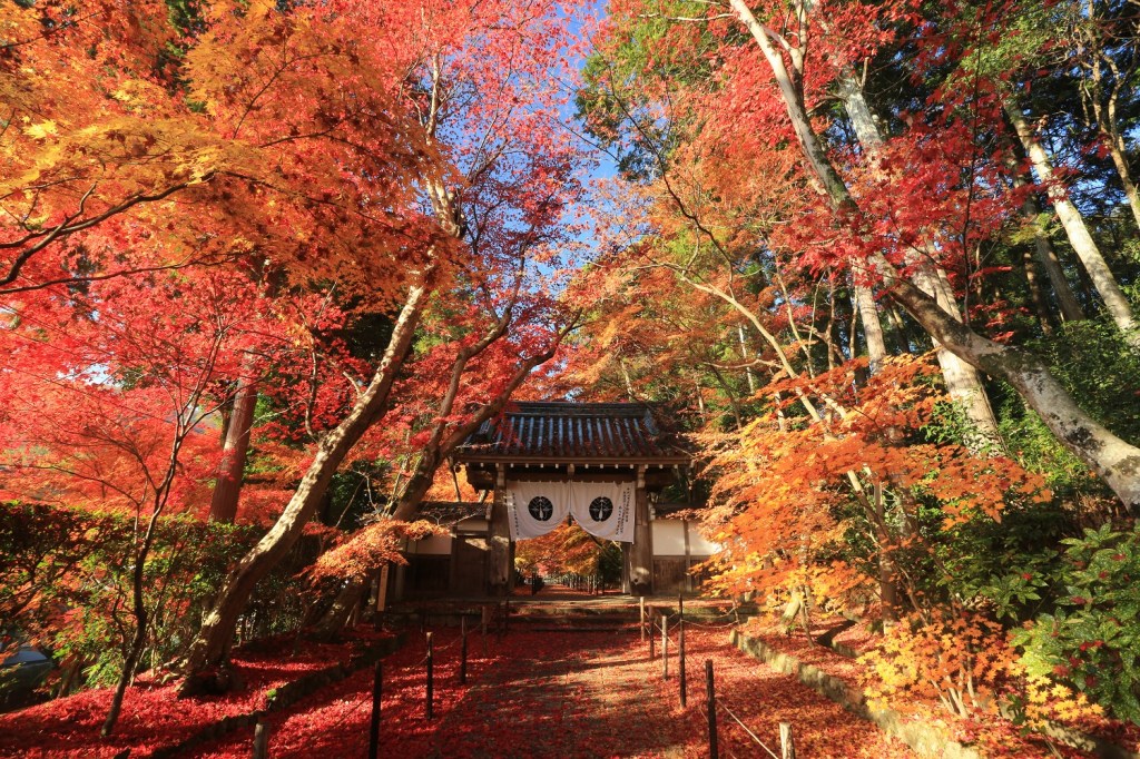 藥醫門在見顷初期顏色會有紅、黃、綠等,層次非常多,也因此成為攝影人士最愛的楓葉取景點,在見顷初期楓況正好,可是會看到很多大砲衝早,一大早開門後就快速往內移動,拖鞋後快走進入主殿區(不能奔跑喔)、出殿後3秒穿鞋、又再衝衝衝到藥醫門,開始拍攝這裡的空景,紀錄尚無人的最美瞬間。