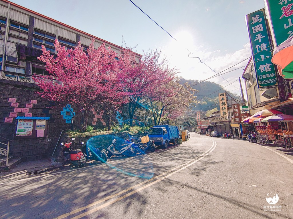 公車抵達梨山站後,對面就是梨山景觀台,天氣好的話可以一覽山岳美景,由於Asta是2月底去的,所以還有一些粉色櫻花點綴,這裡是梨山最熱鬧的中繼點,每天都會有果農在這販售新鮮水果,展望台往右邊下去有公廁,梨山賓館、旅客服務中心等也都在這個區域。