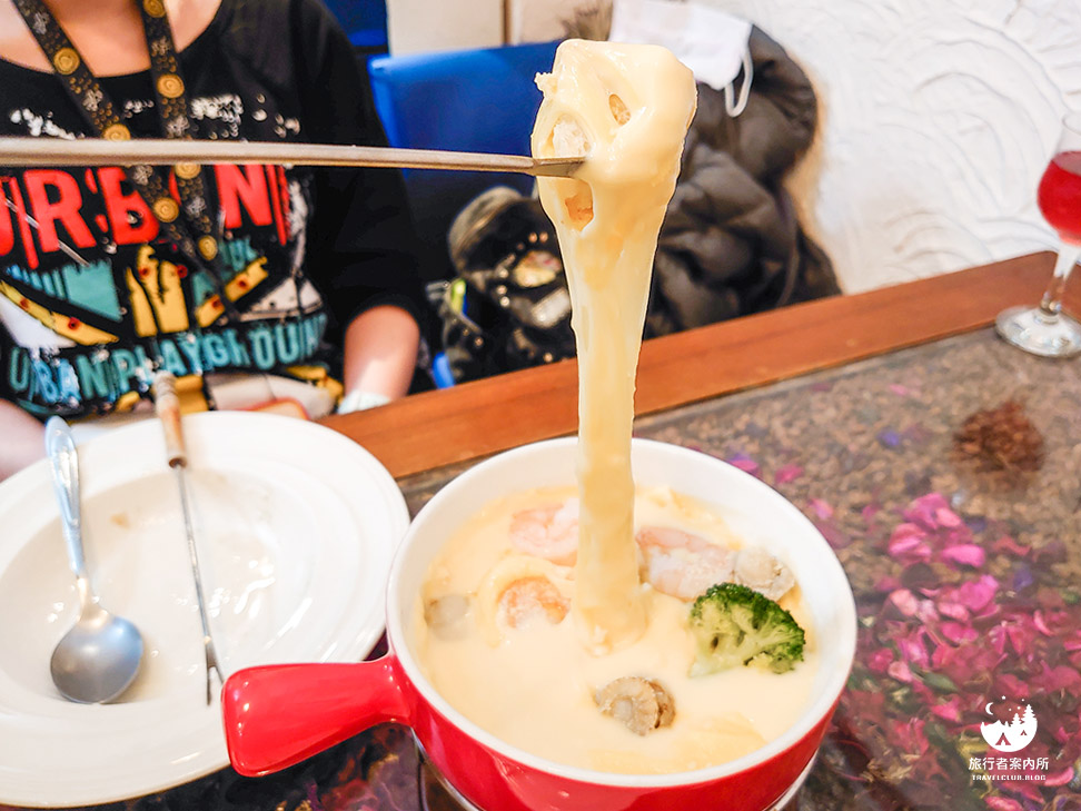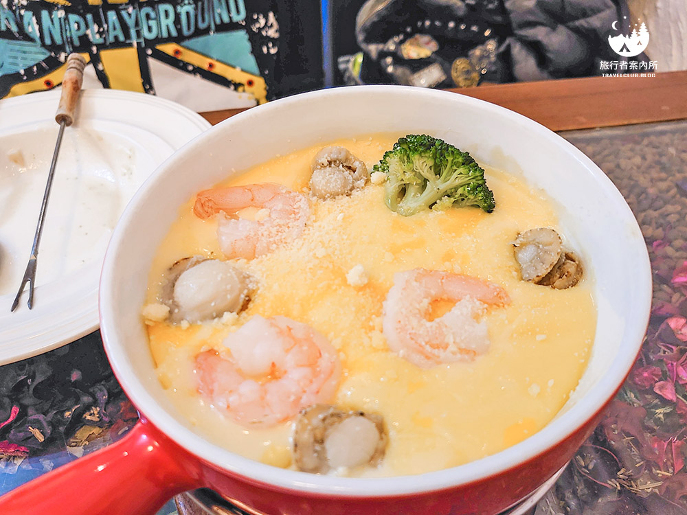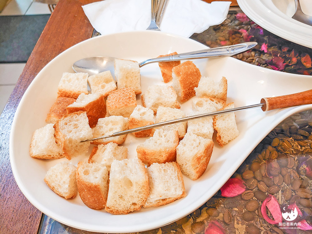 原本配的是南法雞肉口味但我有加價換成海鮮起司口味,一上菜就直接吸引我們的目光,起司鍋下方會附上油燈保溫,讓起司保持流動性,每份起司鍋會包含一份麵包丁,兩個人吃很夠了。
