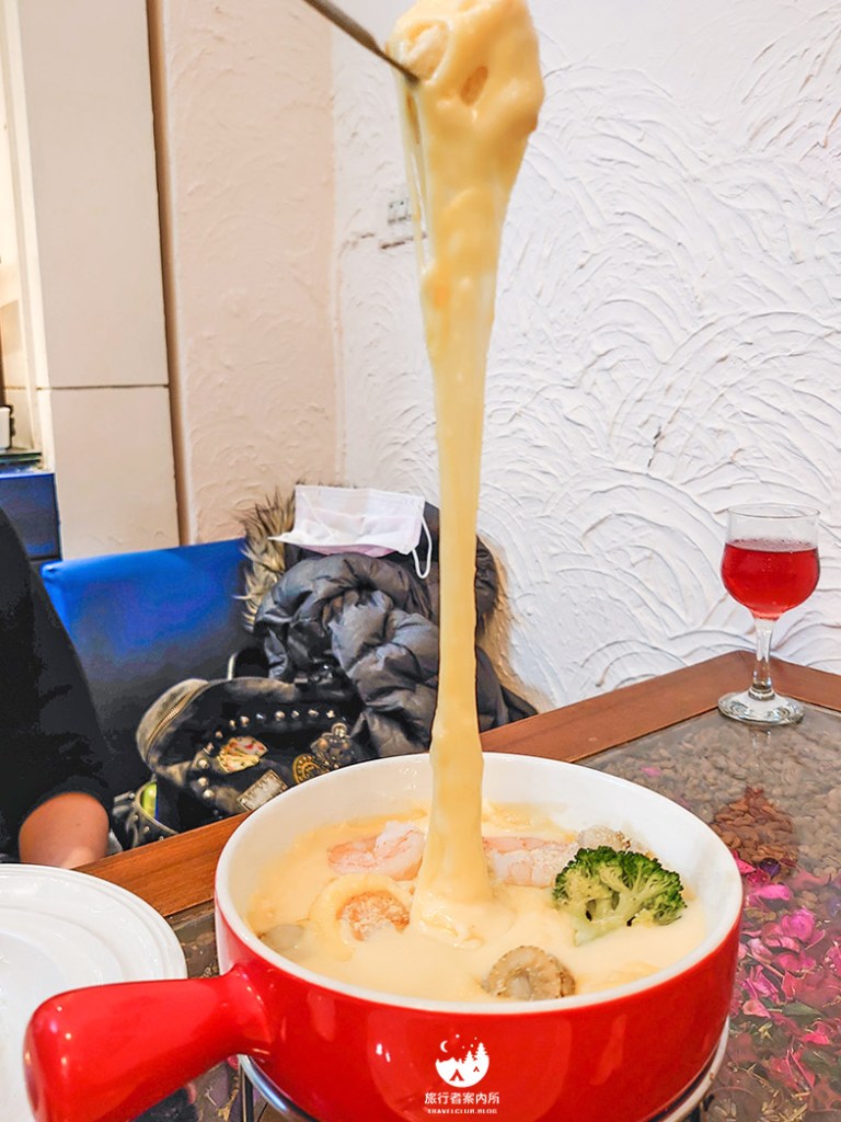吃法就是用鋼叉把麵包叉住,然後泡到起司鍋中!就會像畫面中這樣牽絲,當場口水直流!!