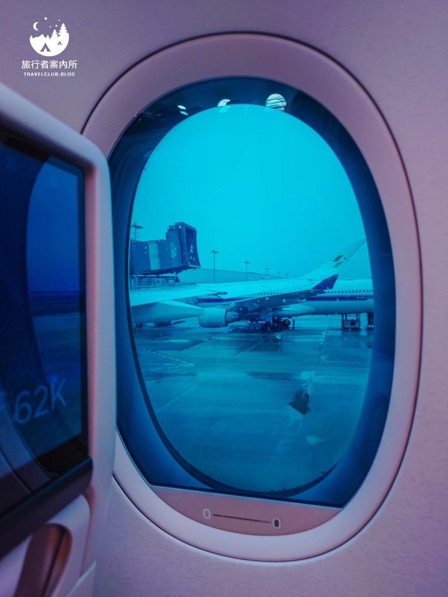 飛機的窗戶是使用觸控式的方式來調整,若你覺得外頭太陽太大,長壓黑點窗戶就會偏向藍色可遮光和擋紫外線,長壓白點窗戶就會還原到原本的顏色(例如準備起降時空服員都會要求窗戶恢復到正常可視狀況),可以隨喜好調整,以往Asta搭乘的班機都是用手動拉的,這倒是第一次搭到這種觸控螢幕的窗戶,很新奇。