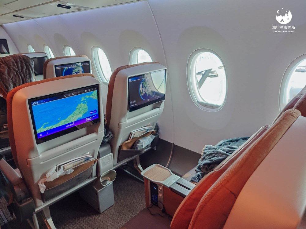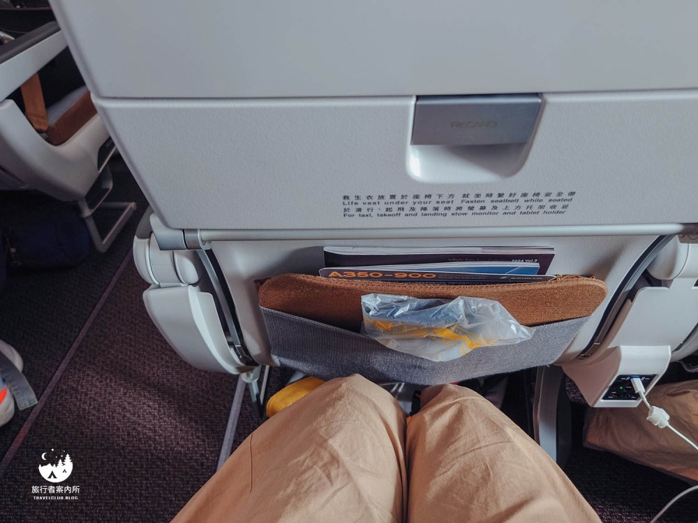 Asta身高163cm一般女生的身高,位置坐起來是很舒適的!挪個舒服的位置,膝蓋離前方位置都還能有不小的空間,此外前方收納袋也會附上耳機、雜誌、免稅商品目錄、右前方還有USB充電插座。