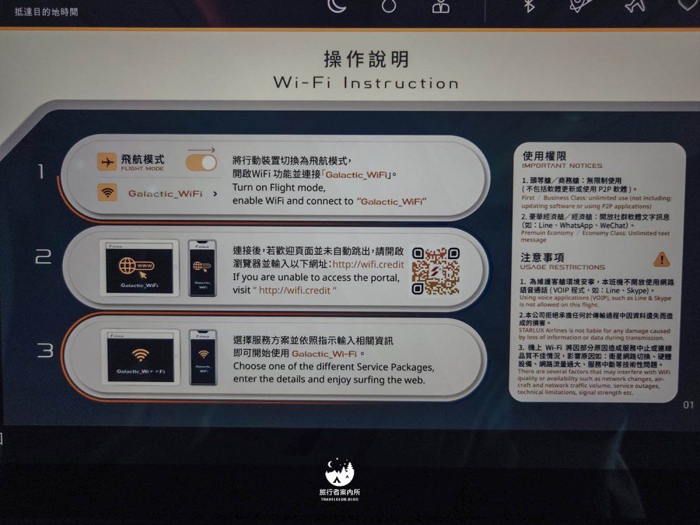 星宇航空所有艙等都有提供Wifi服務,豪華經濟艙、經濟艙的客人可以發文字訊息,例如LINE、WeChat等等,算是很不錯的免費服務(網路連線資訊會在你的娛樂螢幕中)。