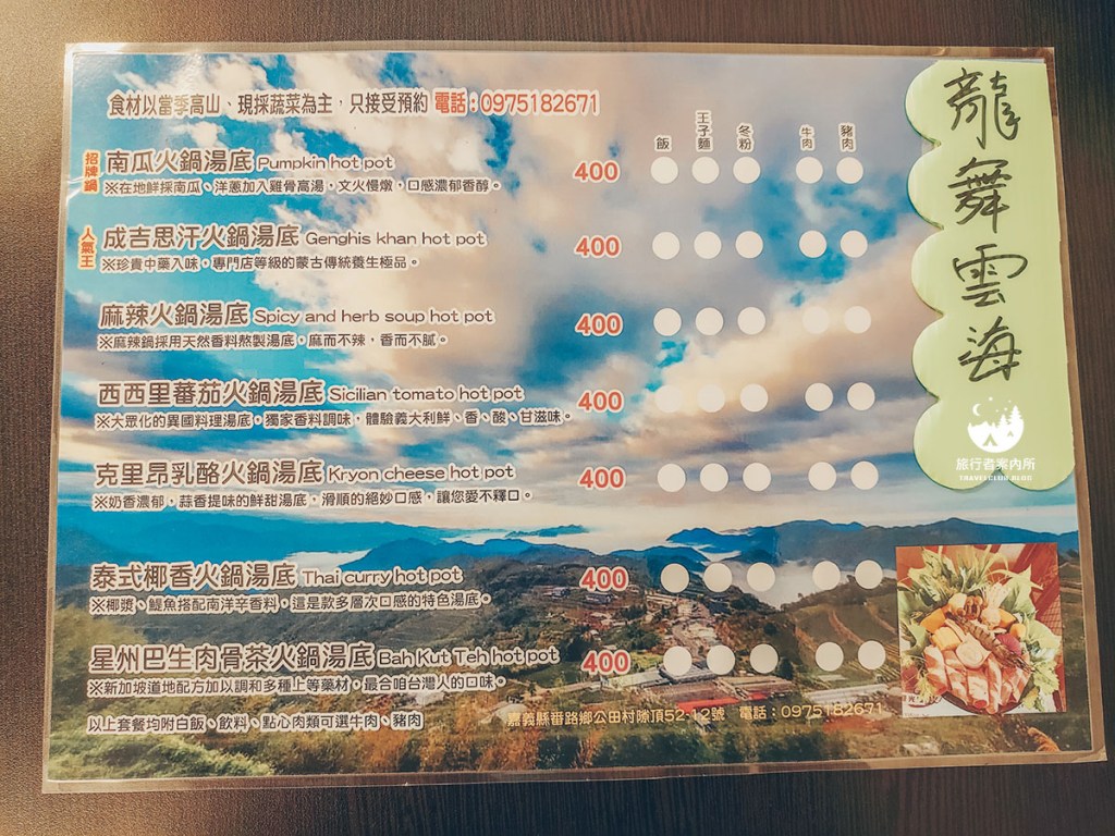 照原路走回去後,肚子也餓啦!在加油站對面、萊爾富便利商店旁有一間當地居民都很推的『龍舞雲海阿里山現採高山蔬菜火鍋』(也叫山上人家),這間只賣火鍋沒有別的,新鮮又清脆的高山蔬菜為主打!