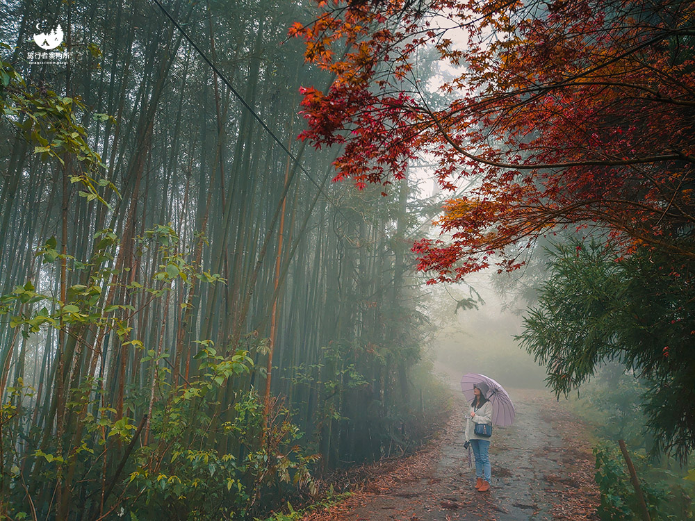 往山谷小鹿營區的路上有條很美的步道,左邊是竹林右邊是楓樹與森林,加上仙氣逼人的霧氣,很像走在仙境般。