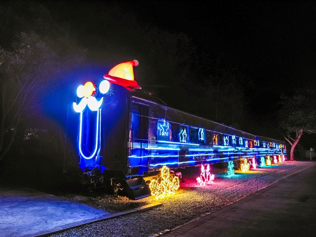 0蛋月台在綠六廣場再往前走一些,腳踏車步道上一路都有亮燈不用擔心太暗,大約再走5分鐘就可以看到今年特設的耶誕列車嘍!