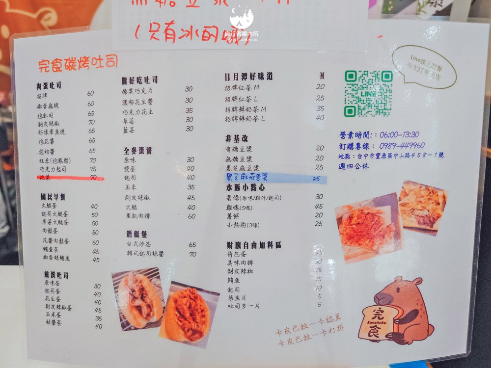 主打招牌為多種口味的肉蛋吐司,再來我個人也滿喜歡吃他們的蛋餅的,偶爾想換口味會吃吃潛艇堡,另外若有特別餐點會公布於完食碳烤吐司官方粉專上。