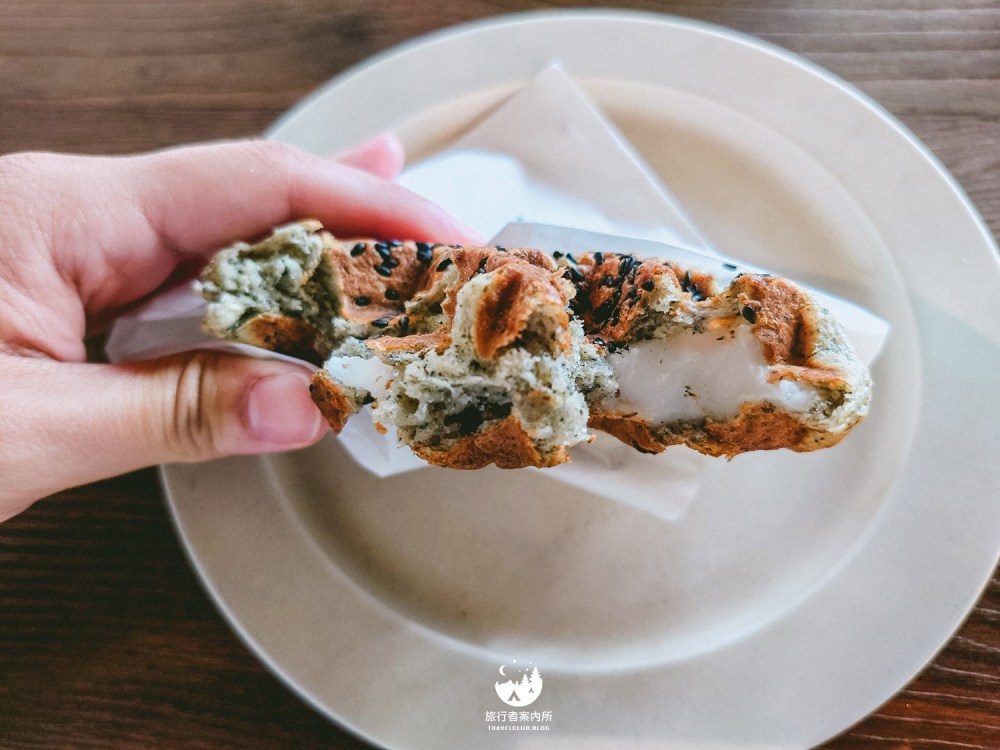 烈日鬆餅一來時店員就跟我說要趁熱吃,我也很乖的就直接一口咬上,沒想到一咬驚為天人,濃濃的芝麻香氣混雜的脆中帶軟的焙茶餅皮,內餡是還溫熱的麻糬,超級好吃!