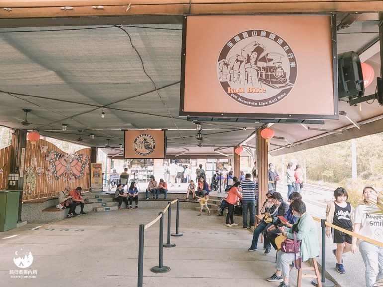 魚藤坪遊客服務中心已經聚集不少等候此梯鐵道腳踏車體驗的民眾了,這個廣場就是集合處,到時候可以看到導覽人員通知大家集合以及聽取注意事項,雖然人多但大家都很有秩序,導覽員的聲音也夠大聲。