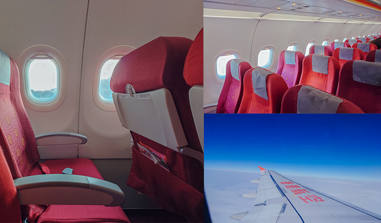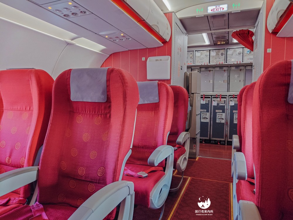 香港航空的特色就是那鮮豔的橘紅色!坐位就是用這個代表色,還有帶些喜氣的「福」字花紋。