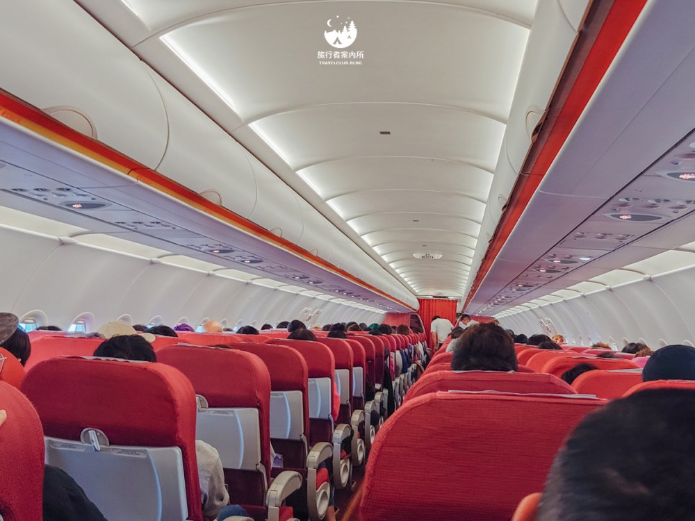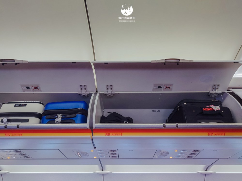 前面有說過因為搭乘這班都是回香港的遊客居多,所以其實機艙行李櫃還挺滿的,畢竟回去多少都會帶些戰利品,隨身7kg行李也可以好好運用,相較下Asta登機時就一個背包隨身輕裝很多。