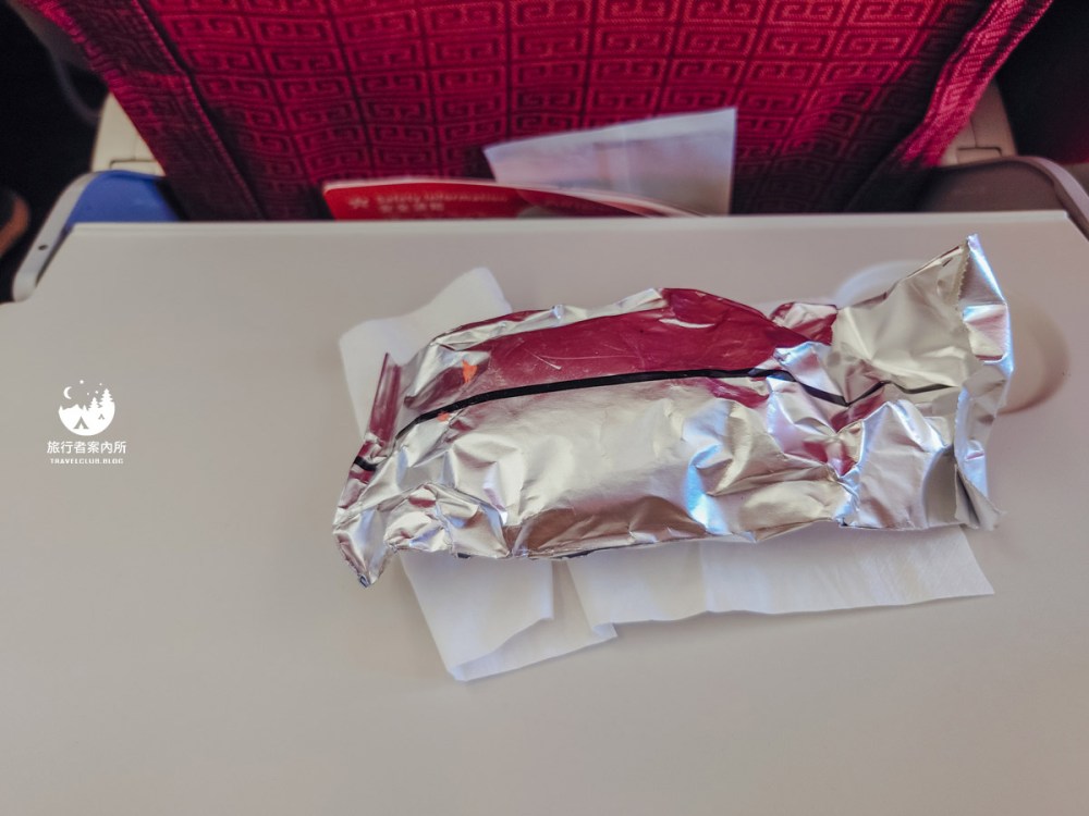 但香港航空不論你買哪種方案的機票,都會為每位乘客準備「點心」,我去程時吃到紅豆包、回程是個有點像酸菜泥的鹹包(我不知道包的是啥但是鹹的)。