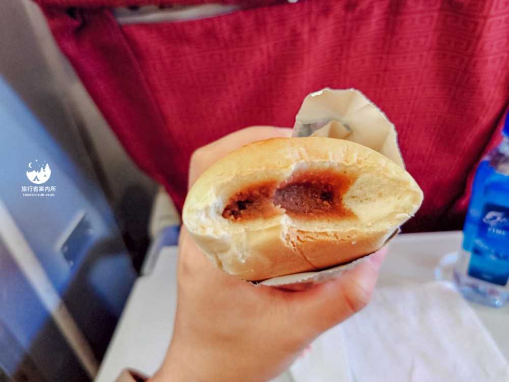 飛上平穩的天空後,座位後方就會飄出陣陣香氣,空服人員把握時間發送點心與水,小小的麵包不大但也挺不錯的,我看每位乘客都有吃完,墊墊胃!