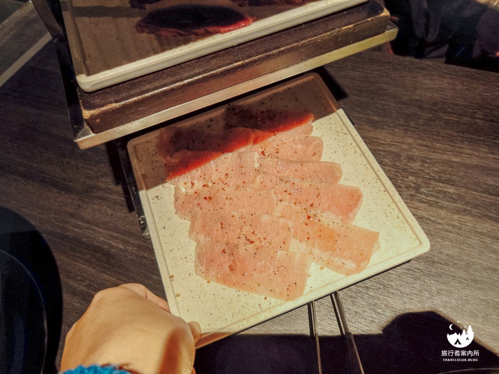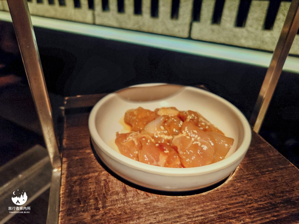 再來是所有套餐都有的去骨雞腿肉、鴨胸和松阪豬肉會用三層架送來,環境昏暗很難拍,我直接一層層拉出來,整體肉的色澤都是很不錯的,尤其是可以吃到較少燒肉店會有的鴨胸肉,算是一大特色。