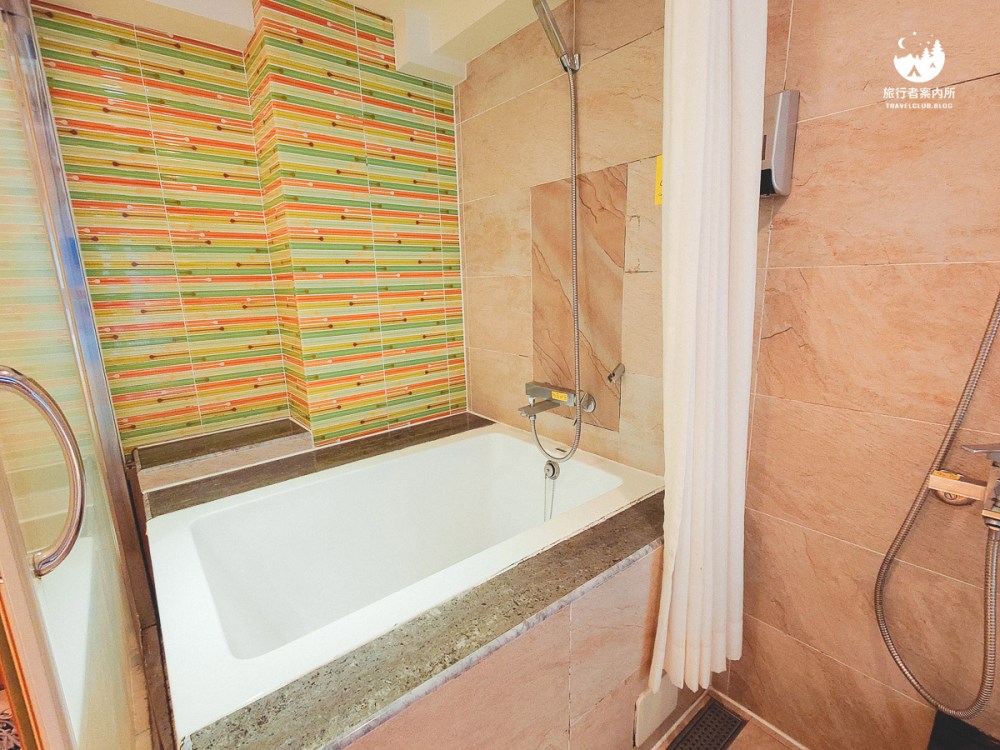 再來就要說說浴室啦,馬桶是免治馬桶、還有浴缸,浴室為了預防潮濕,還有除溼與暖氣功能,在這個價位的旅店來說是很少有的配備,先給個讚!
