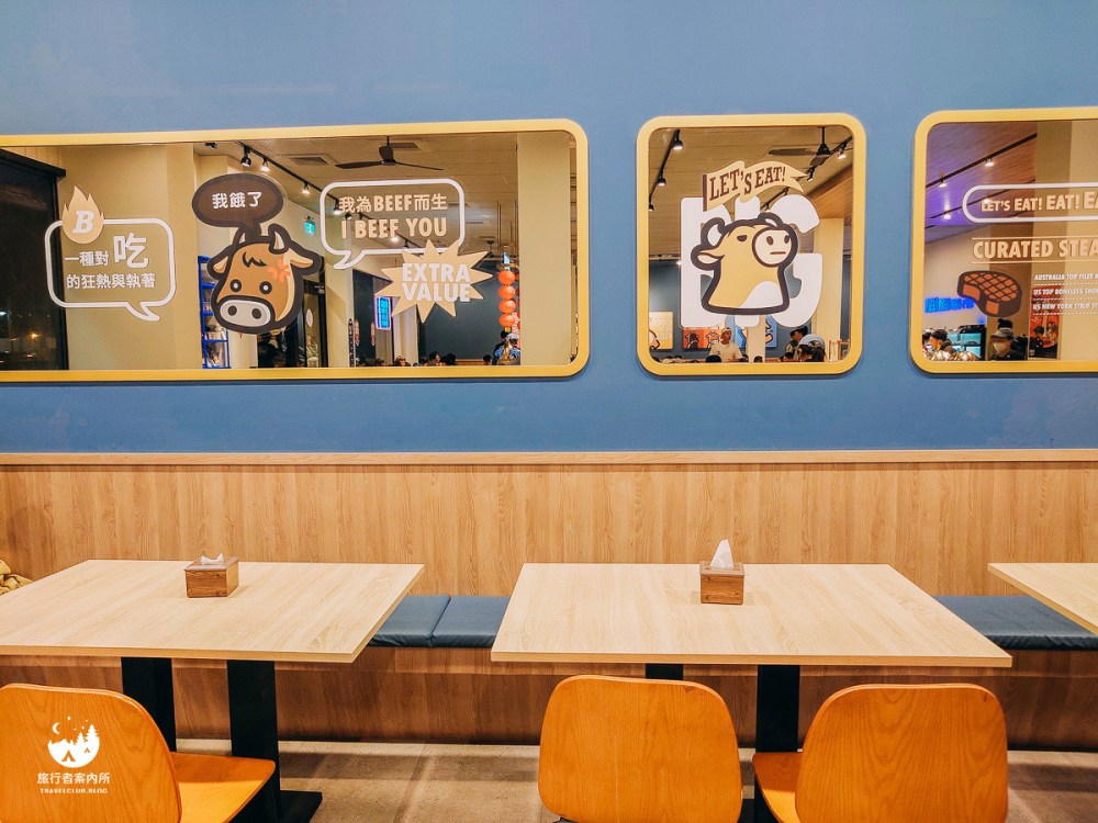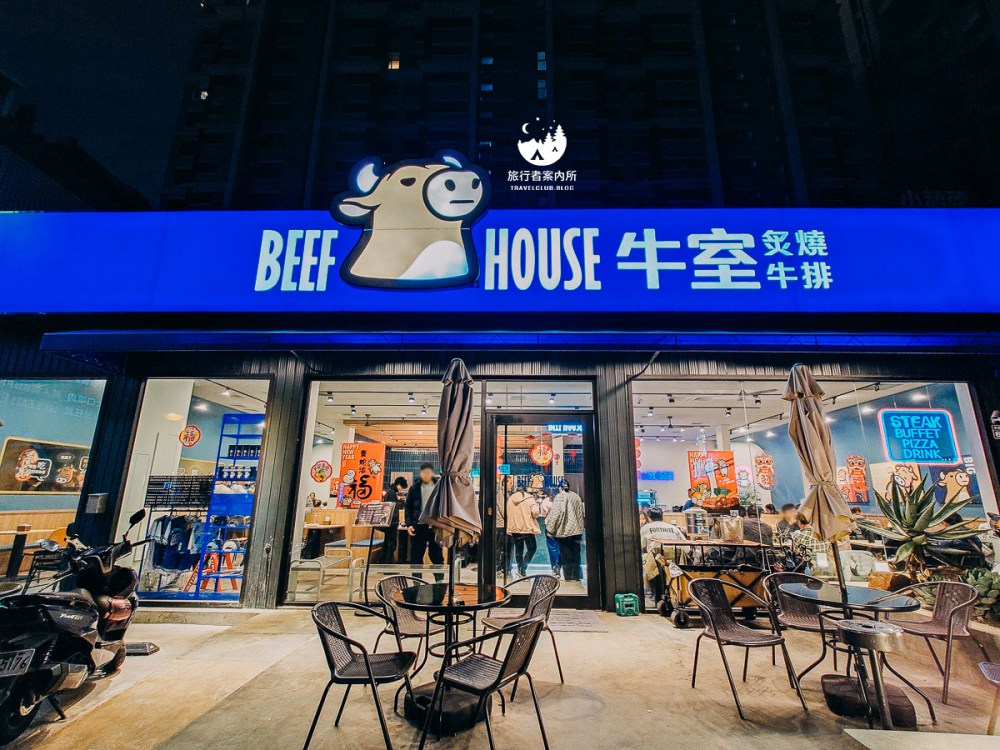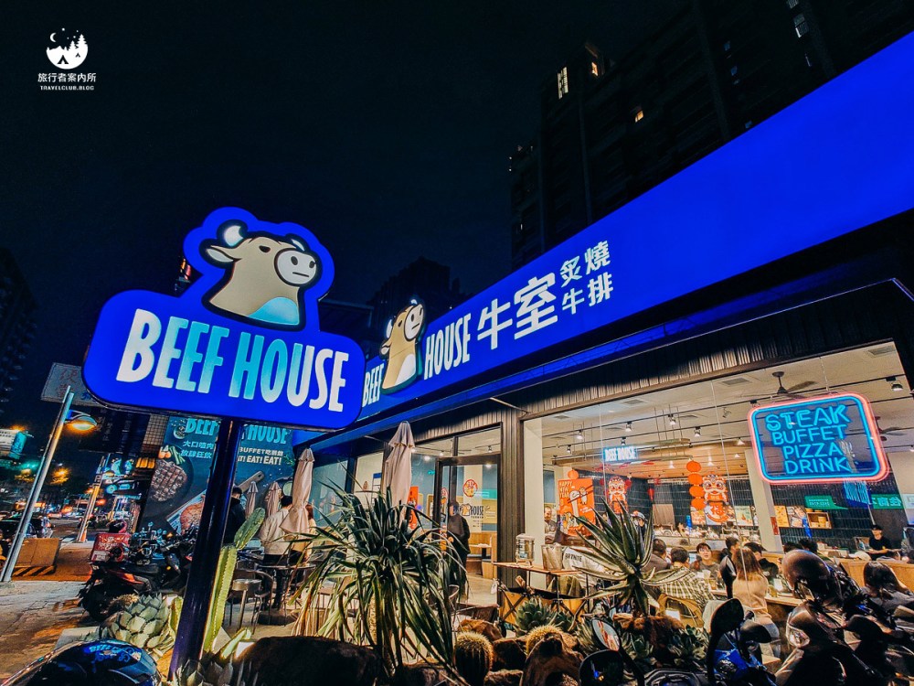 牛室炙燒牛排崇德洲際店招牌主視覺是藍色的,為一整個平面店,從豐原走崇德路往台中市區,過洲際棒球場後都可以看到在右邊的門市,藍色的「BEEF HOUSE」牛頭招牌很明顯。