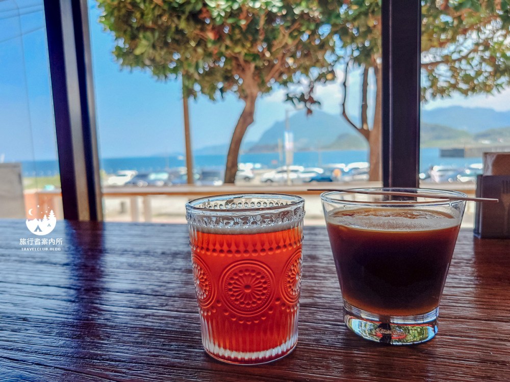 我們選定了靠窗面向外面的位置,可以看到藍天與大海,今天天氣真的是相當不錯,外頭只要多待一會都覺得會被烤焦,還是室內有冷氣比較幸福,像現在喝著飲料、吹著冷氣、看著美景,人生一大樂事莫過於此吧。