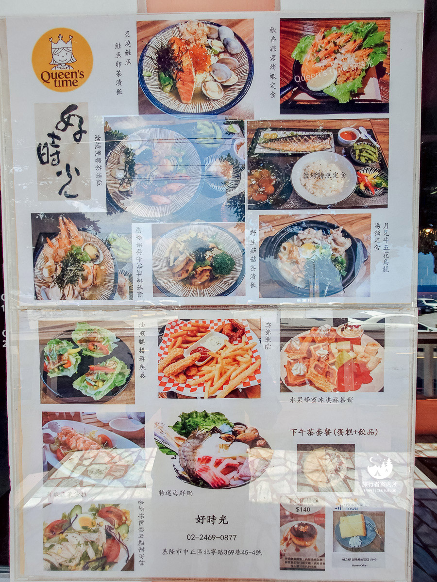 這附近海景第一排的餐廳還真是不少充滿了國外異國風情,因為沒有預約又是平日所以想說慢慢看,有興趣就直接入內,看到這間Queen’s Time 好時光時眼睛一亮,除了本身建築顏色奇特外,連餐點照片都相當吸引我,與友人討論後就決定於此處用餐,待時間到後再前往八斗子車站。