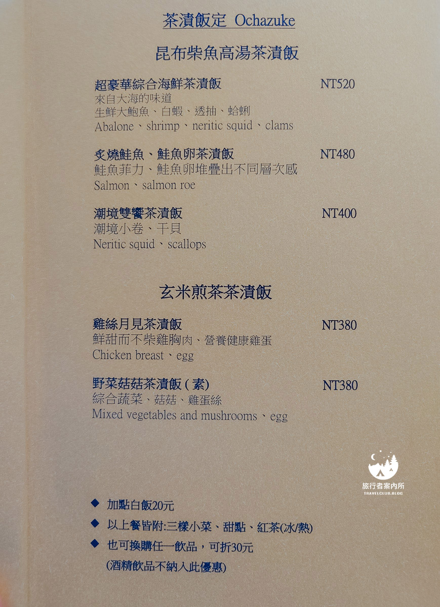 他們家比較特別同時也是招牌的就是茶漬飯,再來亦提供定食與火鍋,其實看店面會覺得應該要提供義大利麵、燉飯這類的,實際上反而完全不一樣。