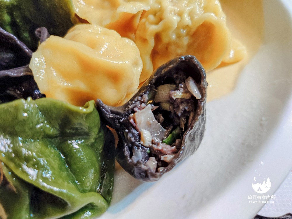 墨魚汁麵皮,內餡為八斗子熟小卷丁和溫體豬肉。
