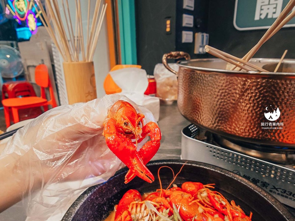 麻辣鍋已經夠辣了,所以小龍蝦點不辣的蒜味,這一來小龍蝦放整碗就是紅通通的,而且數量還不少,店家會附上兩雙簡易的一次性手套,想吃就套上直接開剝。