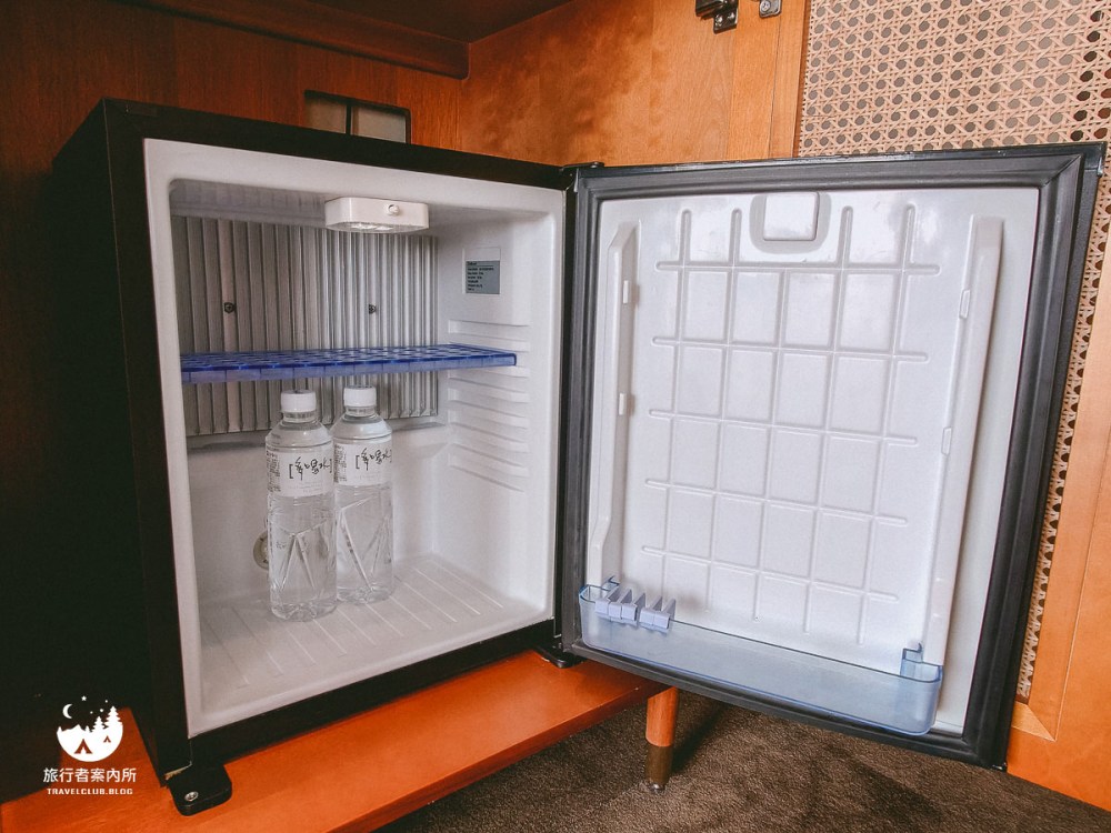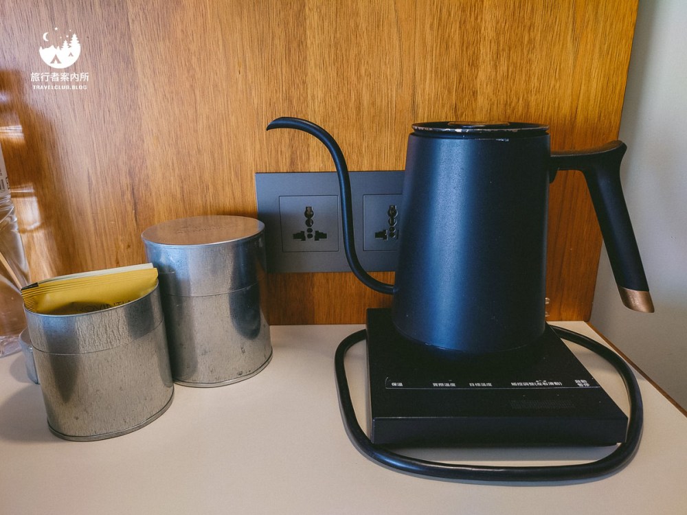 用品都很齊全,衣櫃是開放式的,並有快煮壺、冰箱,瓶裝礦泉水兩瓶常溫、兩瓶放冰箱,茶葉咖啡當然也不會少(在罐子內),另外還提供一些古早味糖果,這小點心的部分我很喜歡。