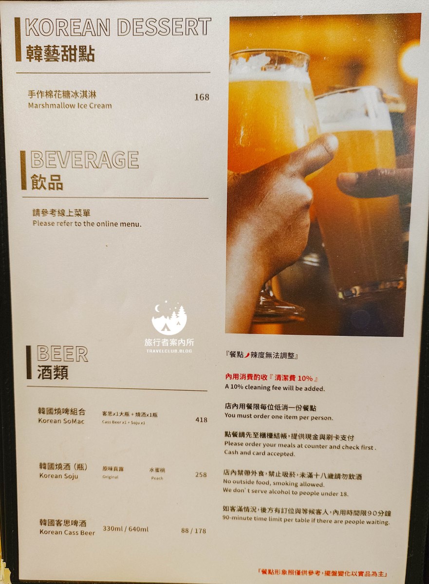 這裡低消為一人一份主餐,並會酌收10%的清潔費,所以若你不是很餓但純單點個韓式豆腐鍋、部隊鍋、炸醬麵,也都可以來KATZ卡司用餐。