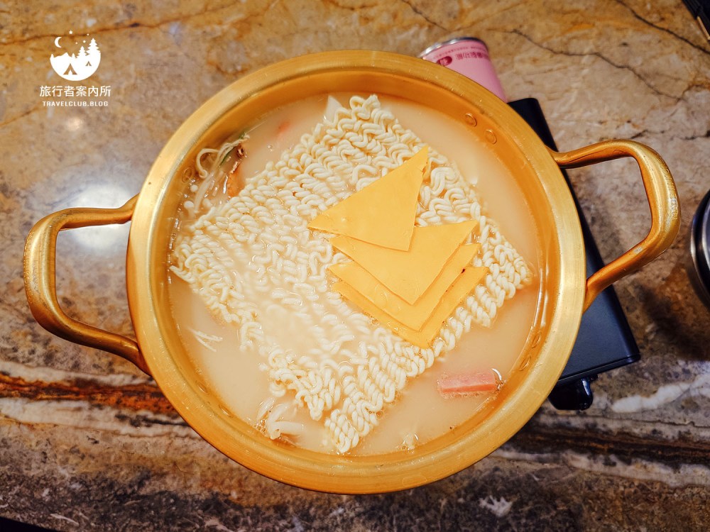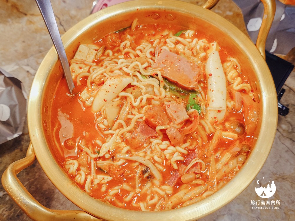 部隊鍋會附一個小瓦斯爐,在煮鍋的過程要記得適時翻攪才不會燒焦,原本還像雞湯的顏色翻一翻就是熟悉的部隊鍋色啦!這部隊鍋吃起來不會辣,應該是因為他們家泡菜偏鹹的關係,所以整個鍋反而鹹感大於辣感,就算會辣也是微微微辣,煮滾後會變得比較稠,相當有味道。