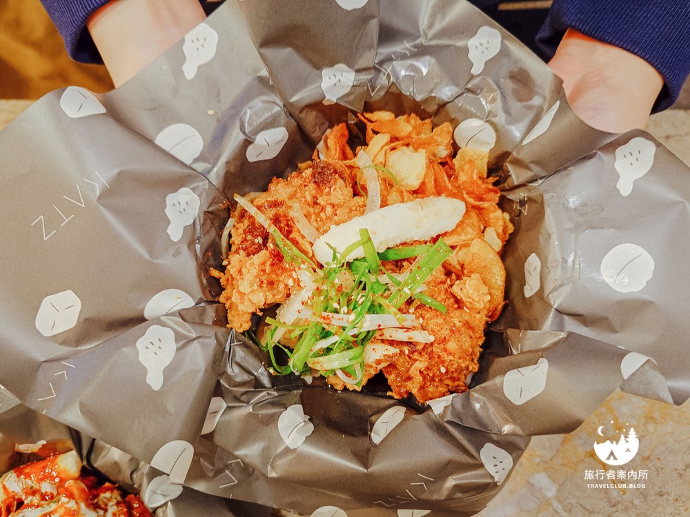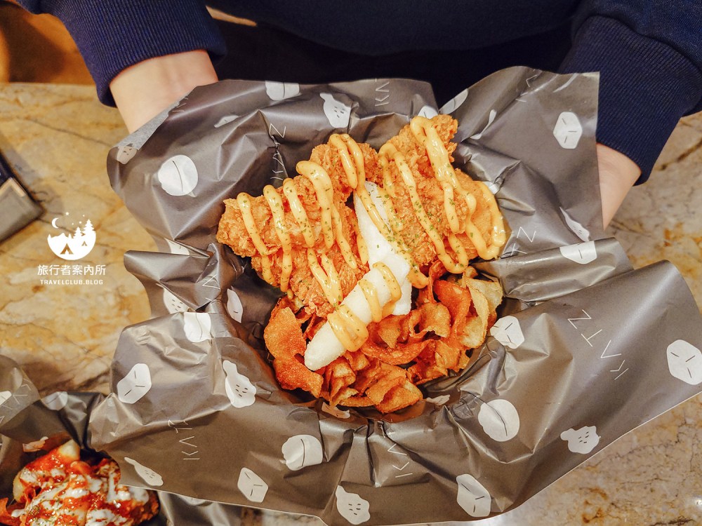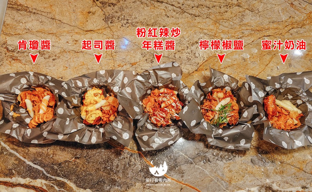 KATZ卡司美術園道店炸雞有五種口味:肯瓊醬(小辣)、起司醬、粉紅辣炒年糕醬(微辣)、檸檬椒鹽、蜜汁奶油,口味除了兩款會有辣感,其他都是小朋友能接受的口味,每份炸雞都會附薯片和年糕(有幾個炸雞就附幾個年糕)。