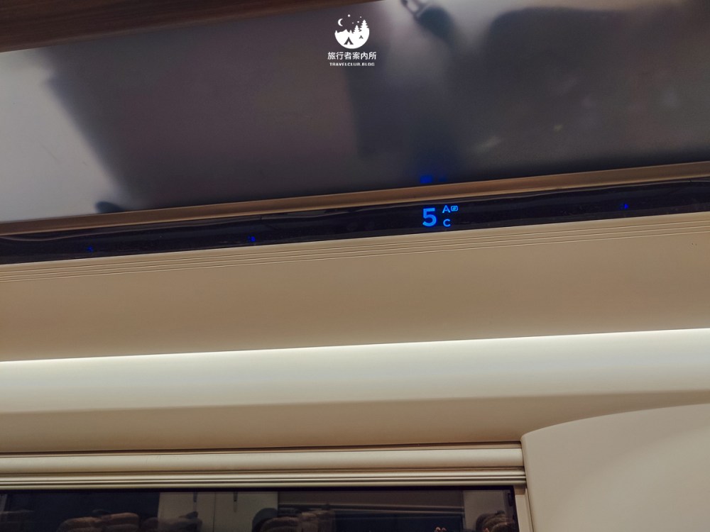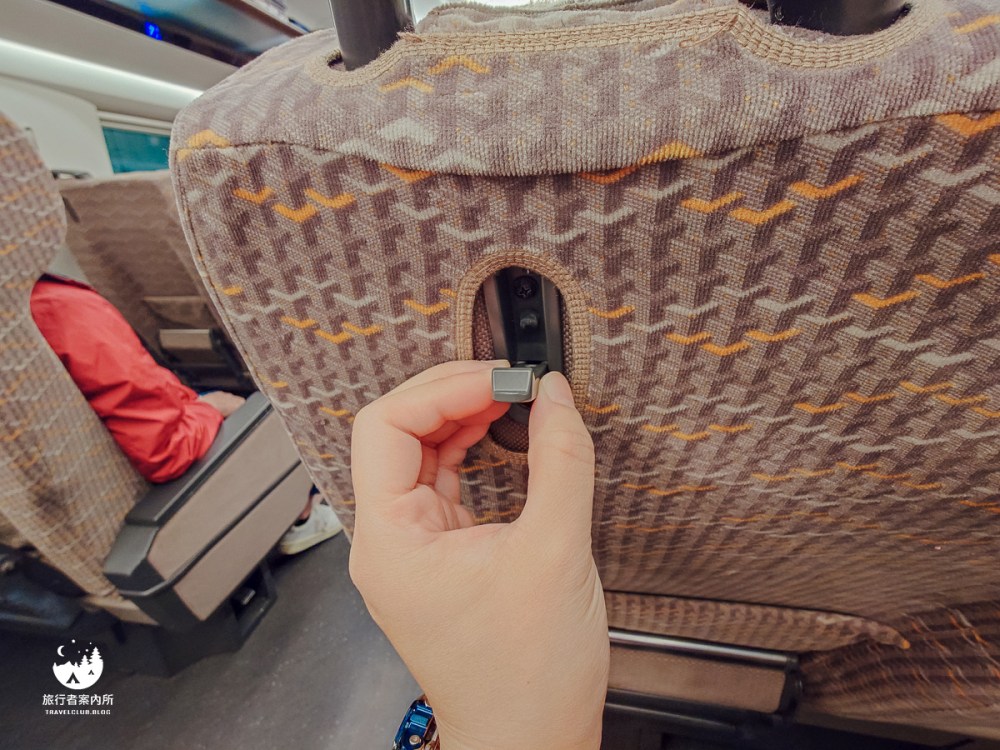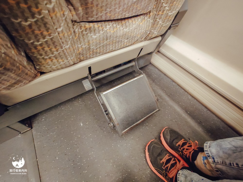 座位的餐桌在前方,USB插孔也在前方配置比較不一樣,因為空間沒一等位大所以沒有設置腳踏板,但相對的可以放24吋以下的行李箱,只是你腳要張開會不舒服,還是建議搭乘高鐵帶20吋以下的就好,若位置上方沒空間放了,至少還能放自己的位置。