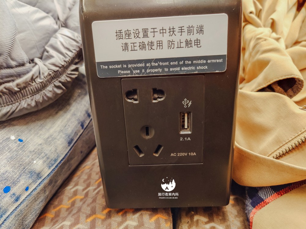 一等位有提供三種插頭,三插、二插、USB,基本上我們會用到的手機充電就是USB,另外注意一下三插、二插的電壓為220V,跟台灣所使用的不一樣,所以若要使用這種插頭需要有變壓器和插頭轉換器。