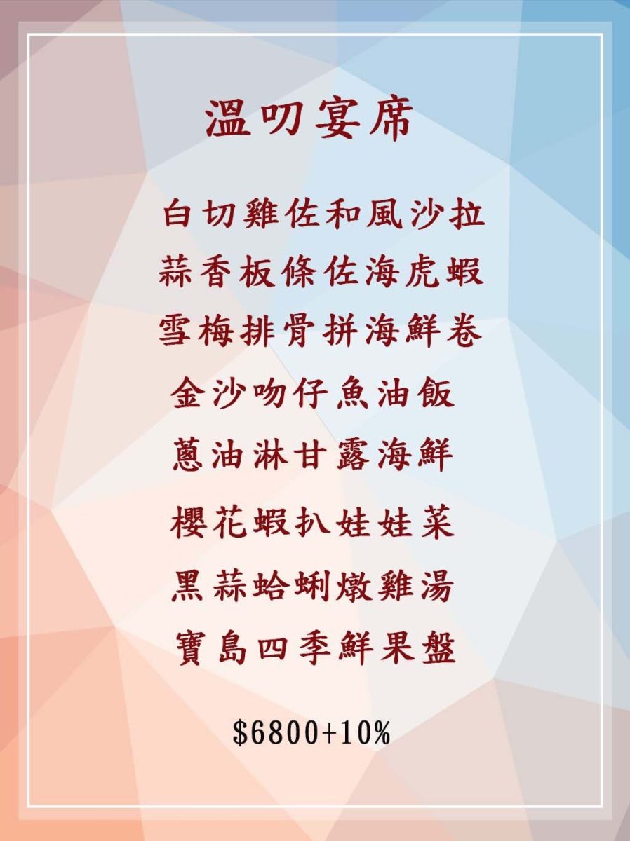 朋友簡單聚餐聊聊,小資族想說就吃6800的桌菜就好,加上一成服務費每個人分擔下來大概7百多,6800提供八道菜色(含季節水果),若男生多我覺得可能會吃不飽,就會比較建議改8800以上的桌菜。