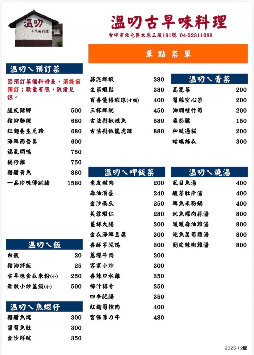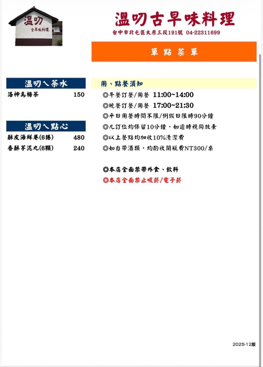 溫叨古早味料理餐廳分成「單點」與「桌菜」兩種,另外特殊節日亦會推出限定桌菜菜色。