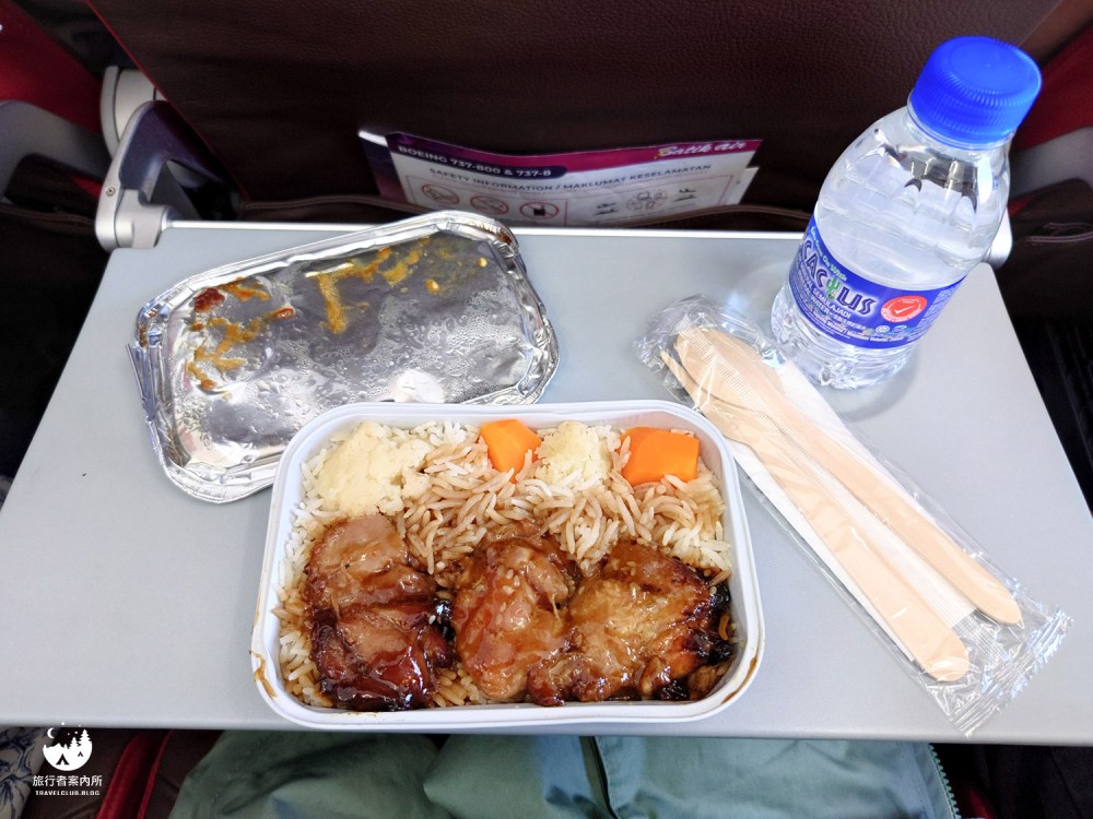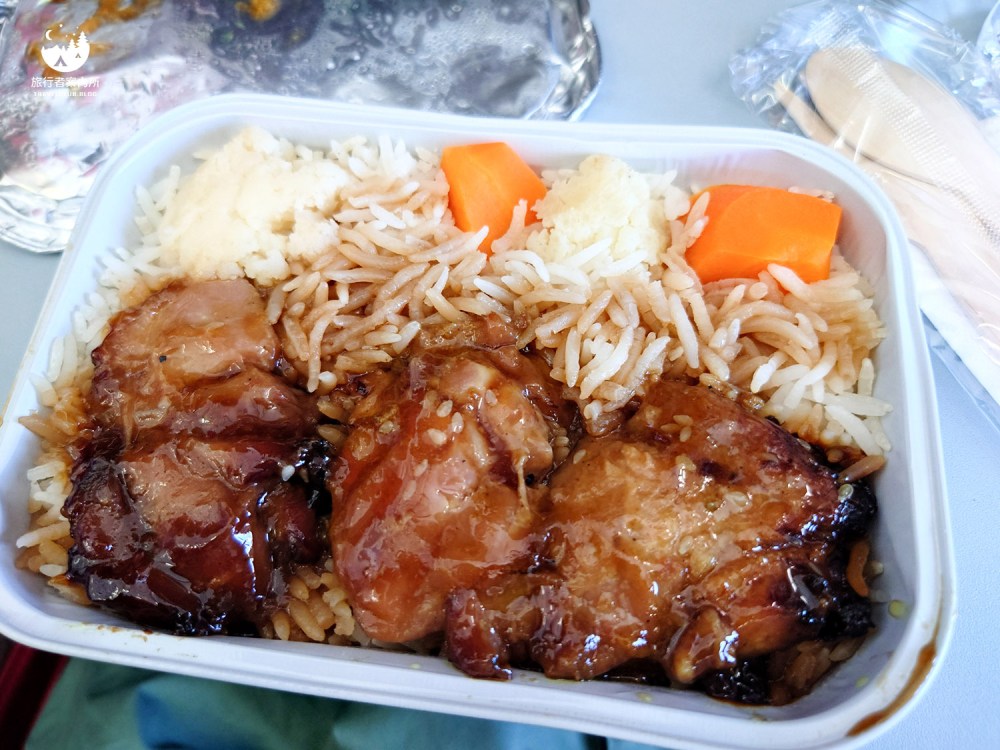 我有加點峇迪的飛機餐「雞肉飯+水」,簡簡單單,米是泰國那種乾乾的長米我不是很喜歡但吃起來也還行、但那醬燒雞肉確實是好吃,送餐時不得不說是被肉肉給香醒的,醬料比較甜但口味不錯、肉好吃,搭配幾朵花椰菜和胡蘿蔔就是機上的美味消遣時間。