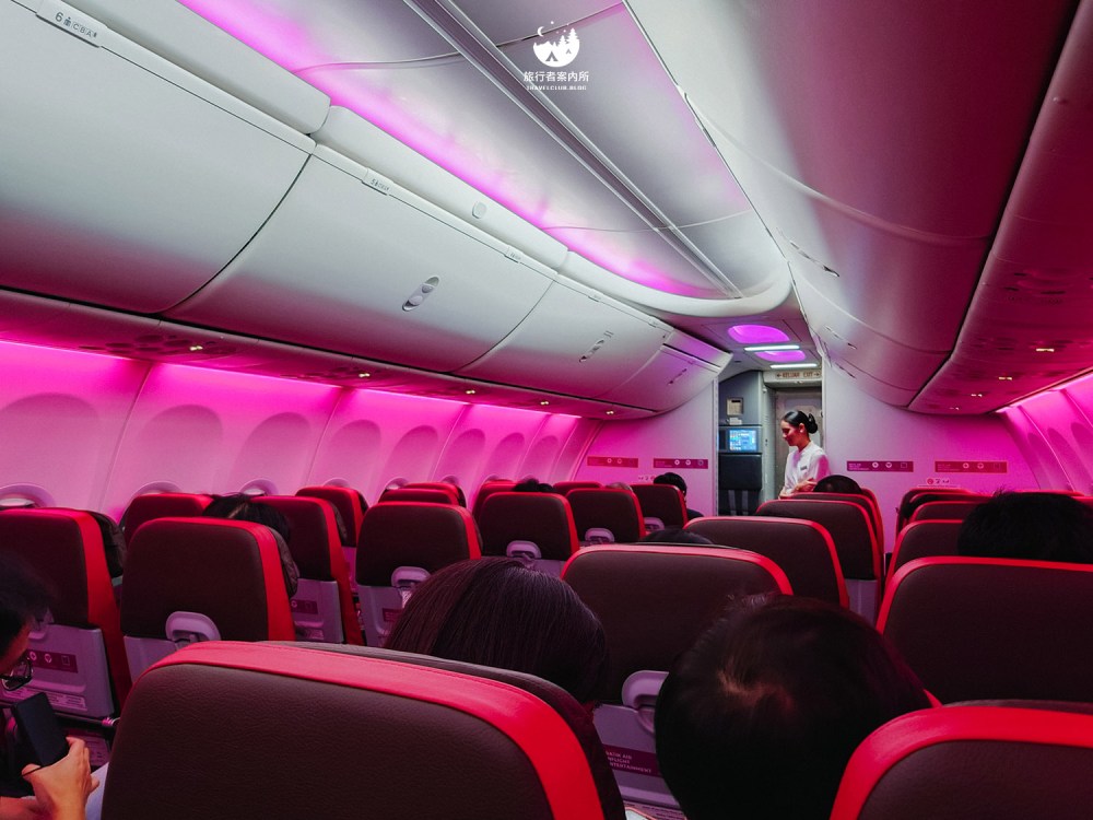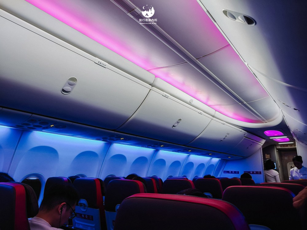 晚班機機上的燈會有粉紫色與藍色,其實整個機艙是感覺滿活潑年輕的,升空後送完飛機餐,不久後就會把機艙燈給熄了,讓乘客好好休息。