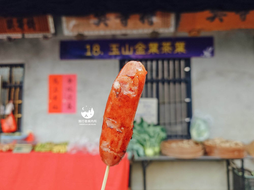 醬塗抹在香腸上那樣敷衍,而是把梅肉、梅酒一起灌到香腸肉內,販售的地點不在古厝,而是在古厝對面靠馬路的攤位,不會找不到,因為這附近就只有一攤在賣梅子香腸而已。