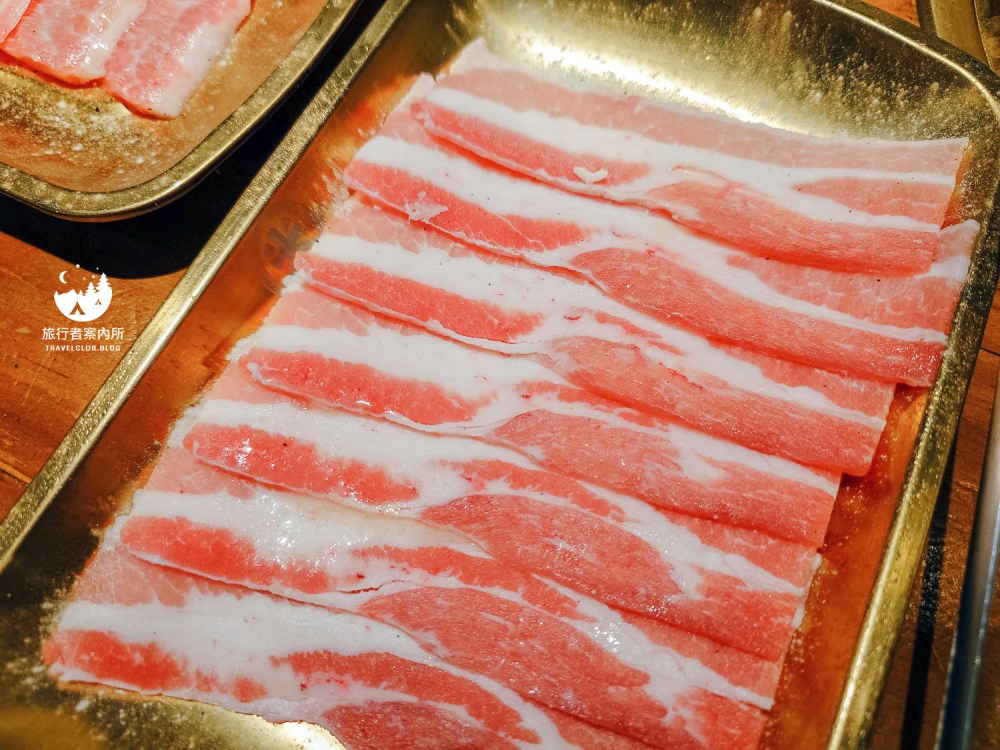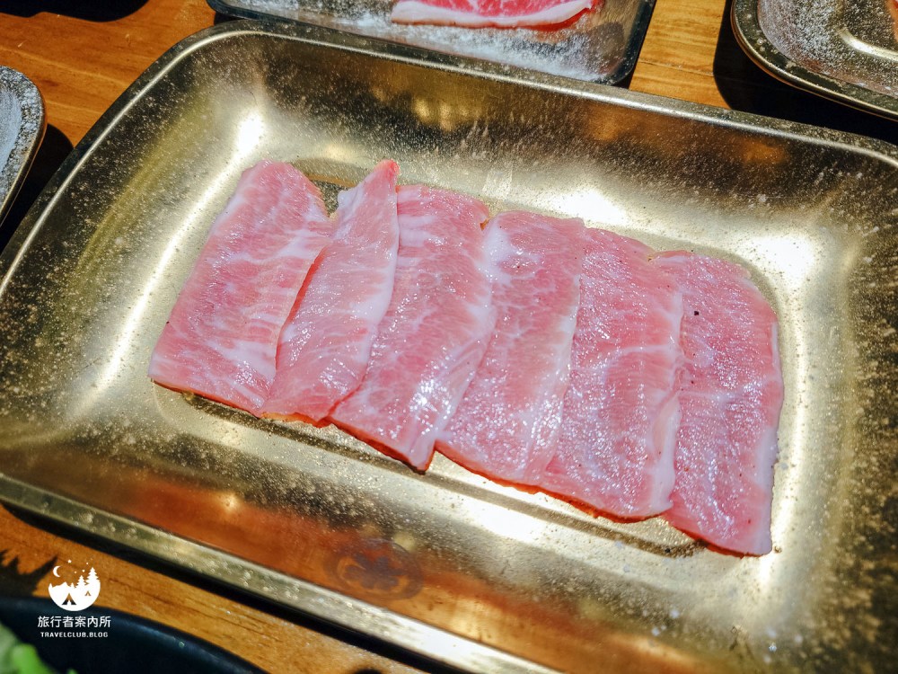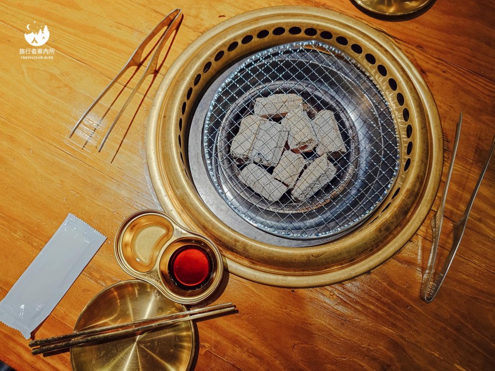比較少見的肉品–豬胛心肉,屬於瘦肉比例高且夾帶細緻油花,也是服務生來幫我們烤幾片後再來換我們自已烤,再加上一些醬料、蔥花,竟然出了牛舌的感覺呢。