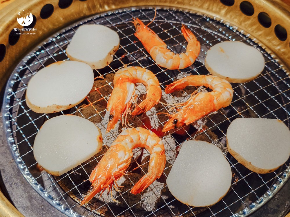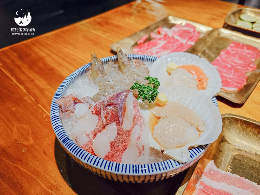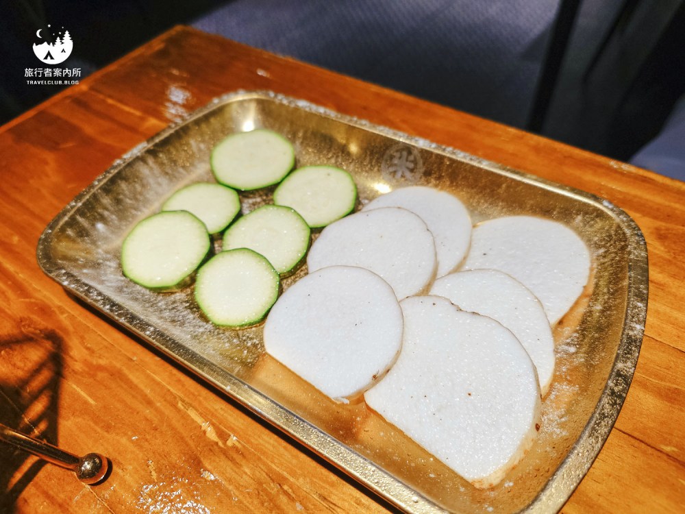 海鮮盤有澎湖小卷、奶油焗扇貝和白蝦,白蝦身體已經去殼,只要肉身變紅就可以直接吃到蝦肉了免剝殼(貼心);蔬菜盤給的是山藥跟櫛瓜。