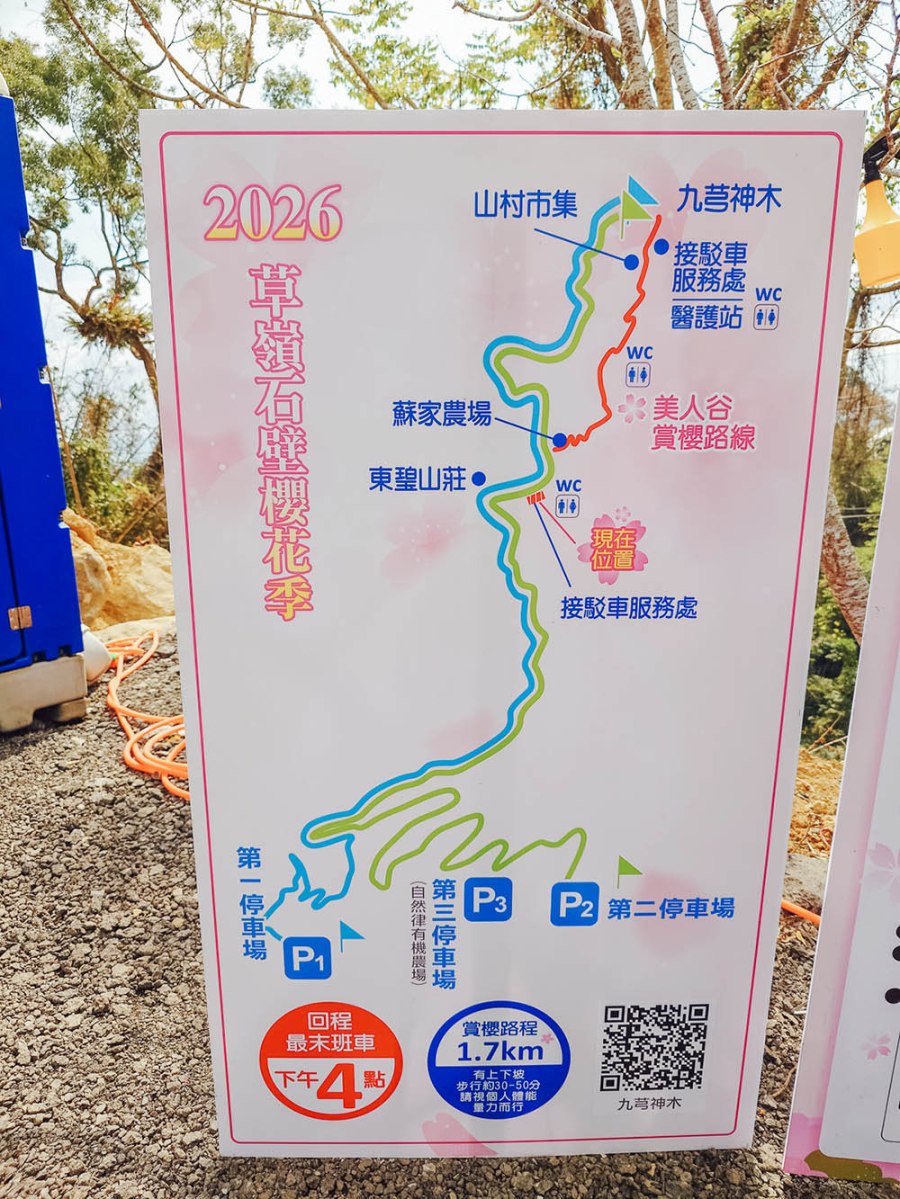 接駁車會開到草嶺石壁的【東碧山莊】接駁點,停車場這就有流動廁所,再沿著路往前走就可以抵達此次主要的賞櫻點美人谷。