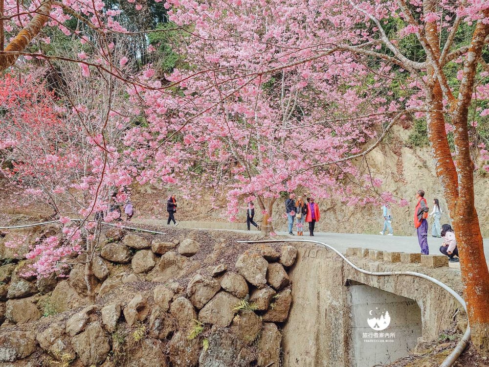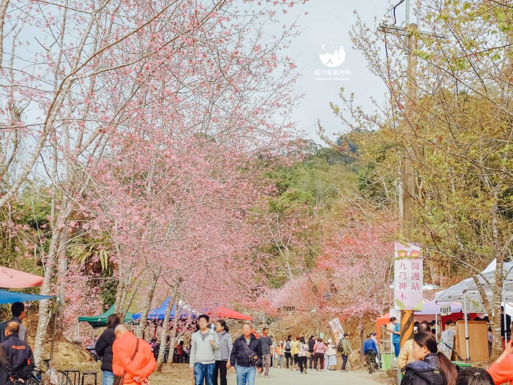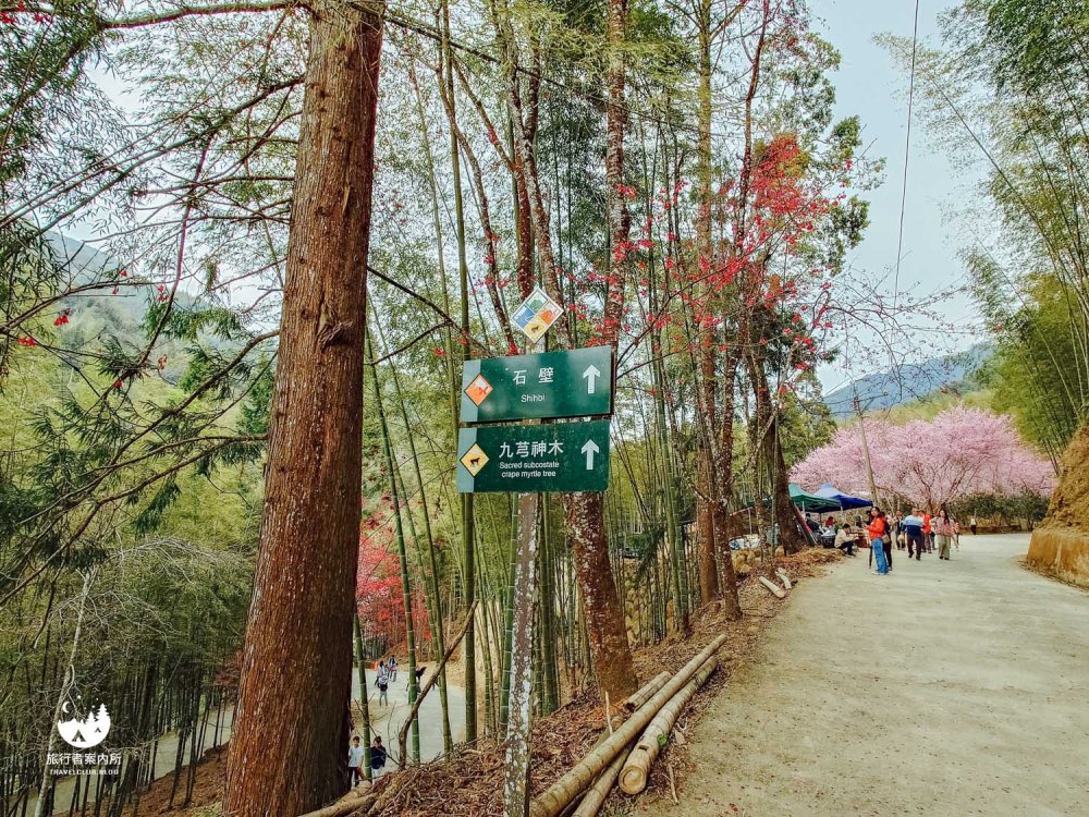 還要再走一段路才能抵達接駁點,九芎神木這裡的櫻花是屬於沿路綻放的型態,跟美人谷都集中在一區的種植方式不同,賞起來各有一番風情。