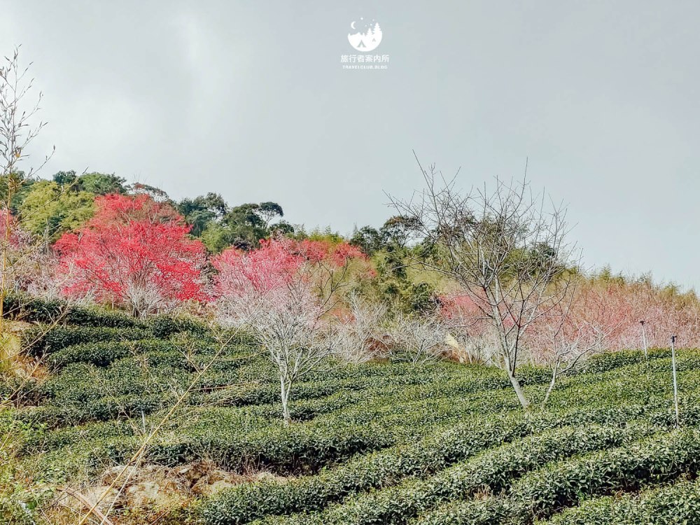 一路可以欣賞到茶園與櫻花、山巒並存的景色。