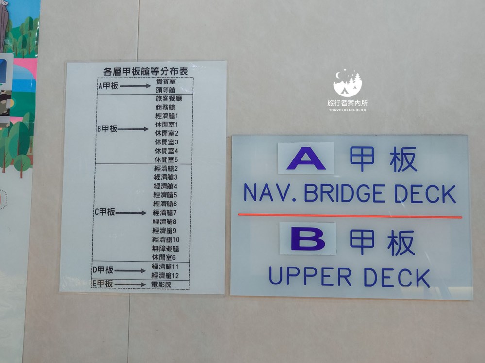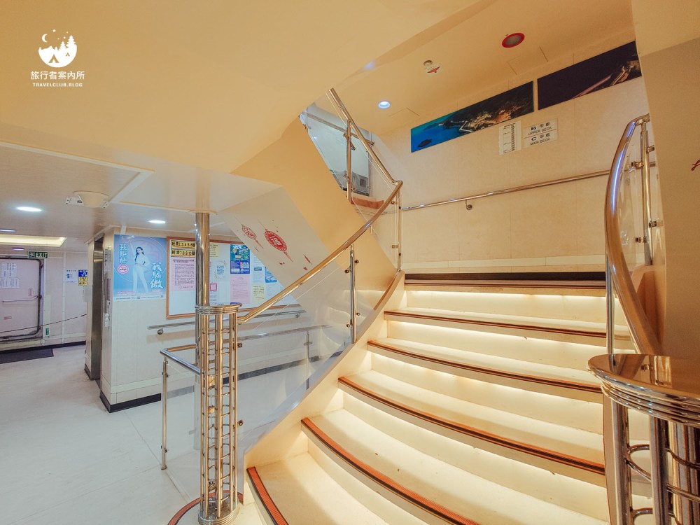 A甲板最高、E甲板最低,可以看到最底層竟然還有電影院,我有走進去看看,其實位置滿舒適的類似躺椅,還沒開航就看到很多人來這佔位置,但因為味道跟船艙壓力不是很好我看一下就出來了,如果你會暈船,強烈建議就不用往電影院去,再來B甲板有餐廳跟休閒室,Asta的位置是C甲板,趁船還沒開始航行就往上參觀一下。