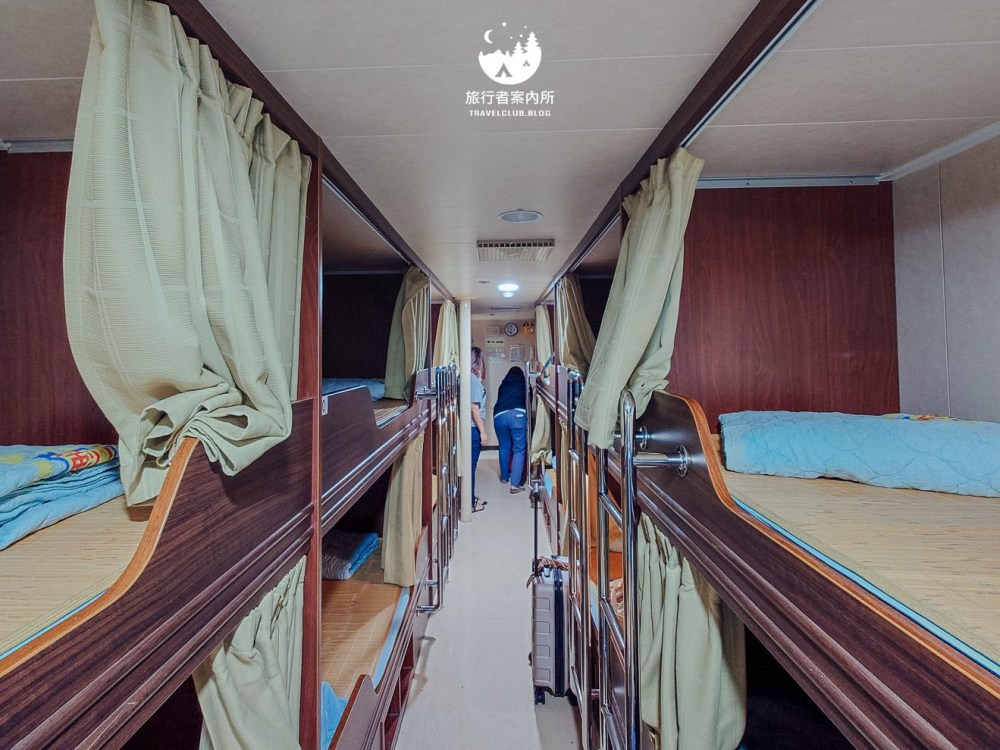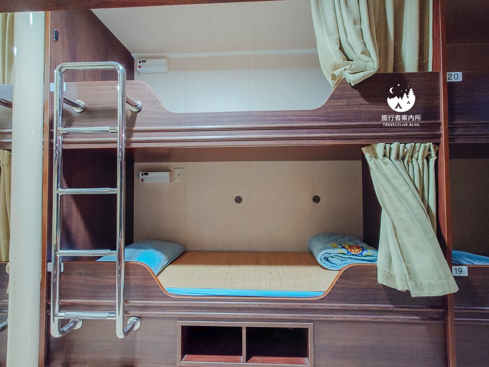 下方還有兩隔櫃子是讓你放鞋子用的,不要懷疑風浪大時你的鞋子也會飛走,所以要記得放在櫃子內,也方便同寢遊客走動。上下舖就像學生宿舍那樣主材質為木質,提供薄棉被、枕頭(有一次性枕套),另外都有拉簾保有私人隱私,若只是純睡覺那也相當夠了。
