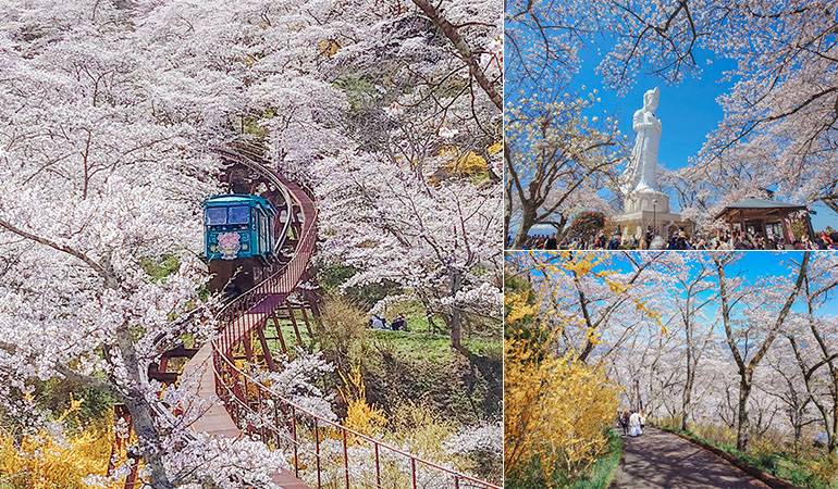 日本宮城縣柴田町最著名的兩大賞櫻名所就是「白石川堤一目千本櫻」和「船岡城址公園」,這兩個點也是宮城縣唯二入選櫻花名所100選的賞櫻景點,通常會安排在同天一起欣賞!船岡城址公園,擁有非常夢幻的櫻花纜車,滿開時絕對會讓你的鏡頭拍不停,公園內1千多棵吉野櫻同時綻放,粉色佈滿整個山頭。